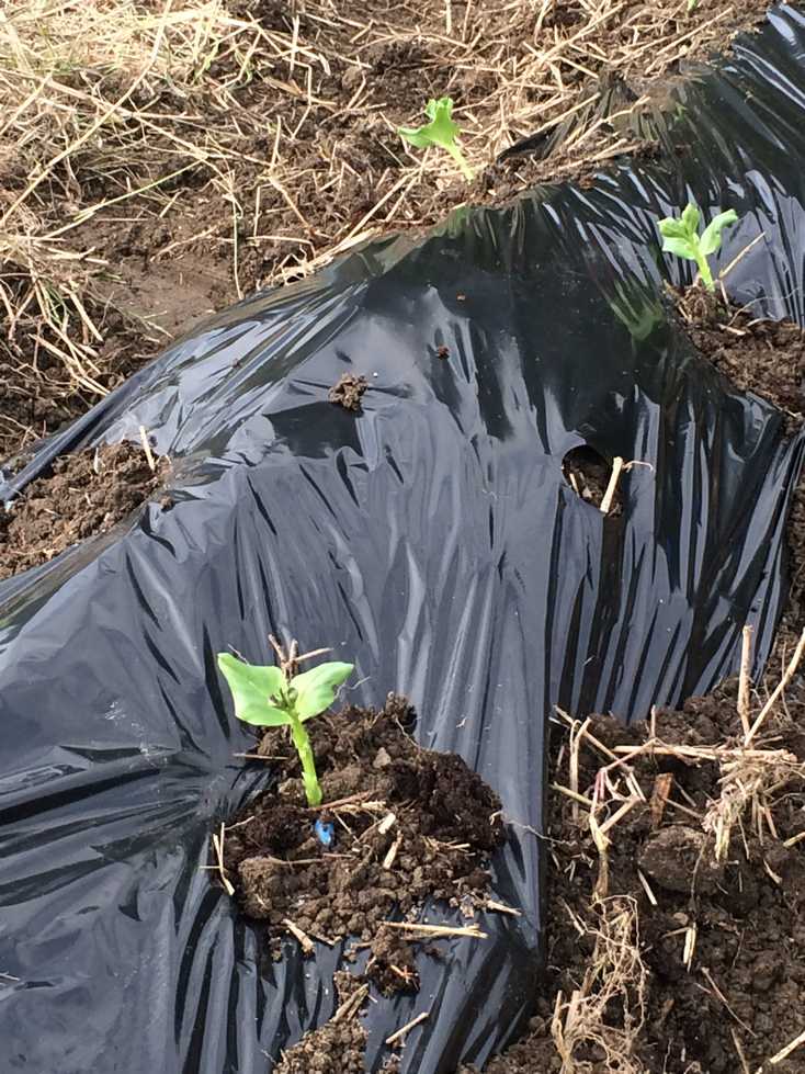 午後からの実習では肥料等をまいた後、耕うん、うね立てをし、タマネギ、ソラマメの苗にはマルチを張り定植しました。
