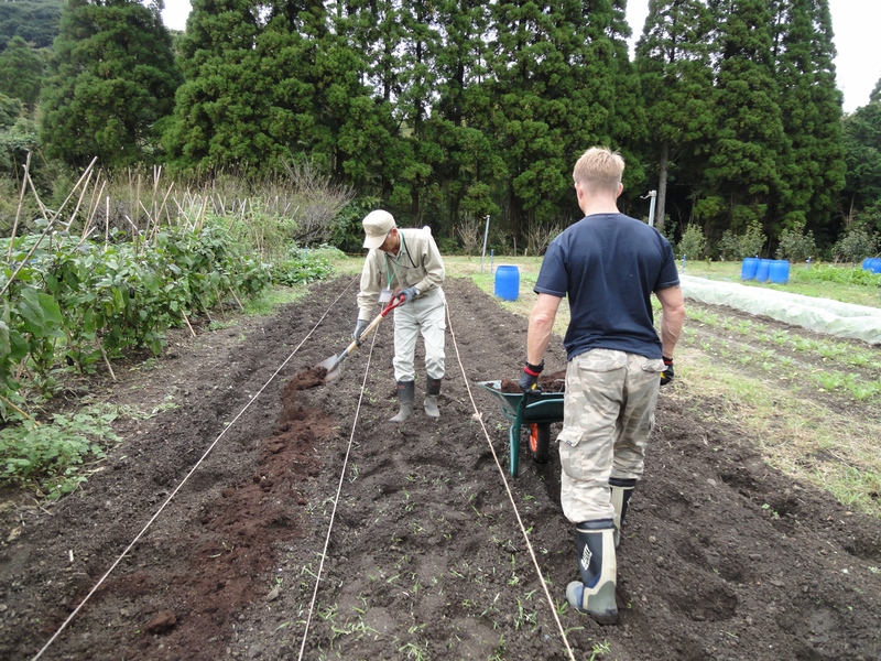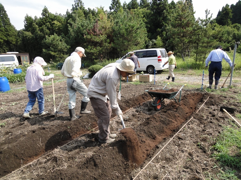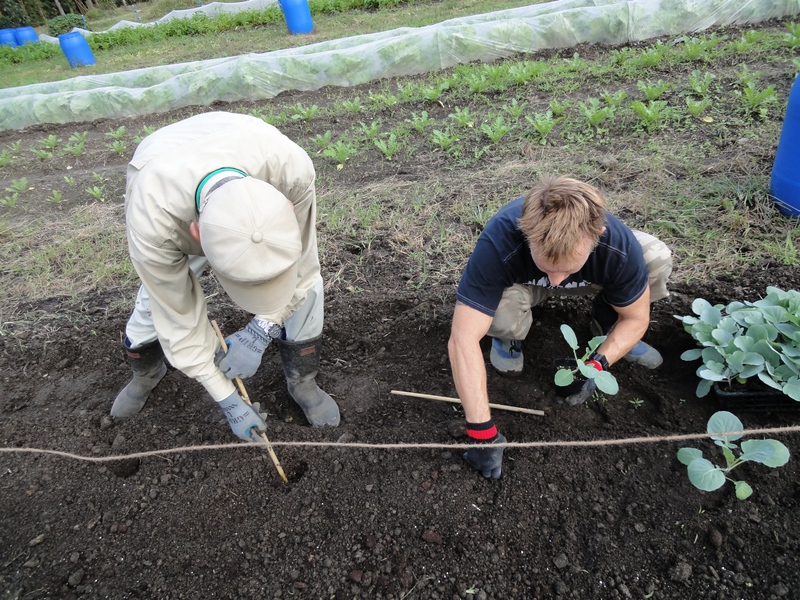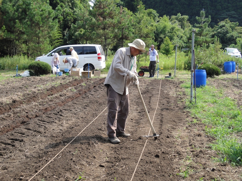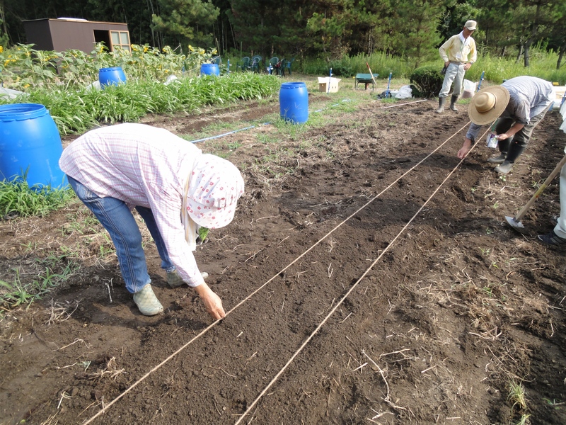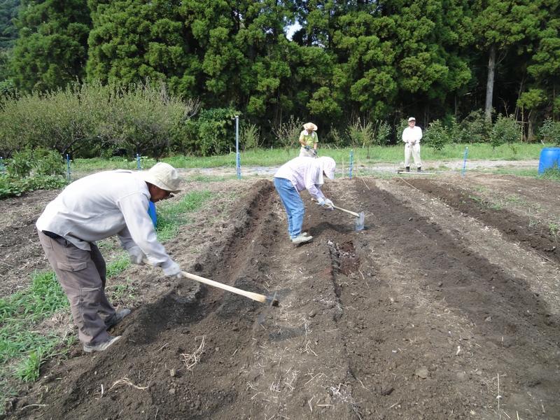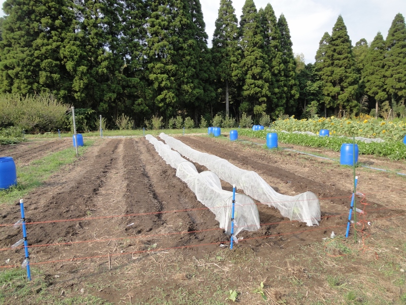 大根の種を蒔くのと同時に白菜の苗を植えるベッド作りをしています。