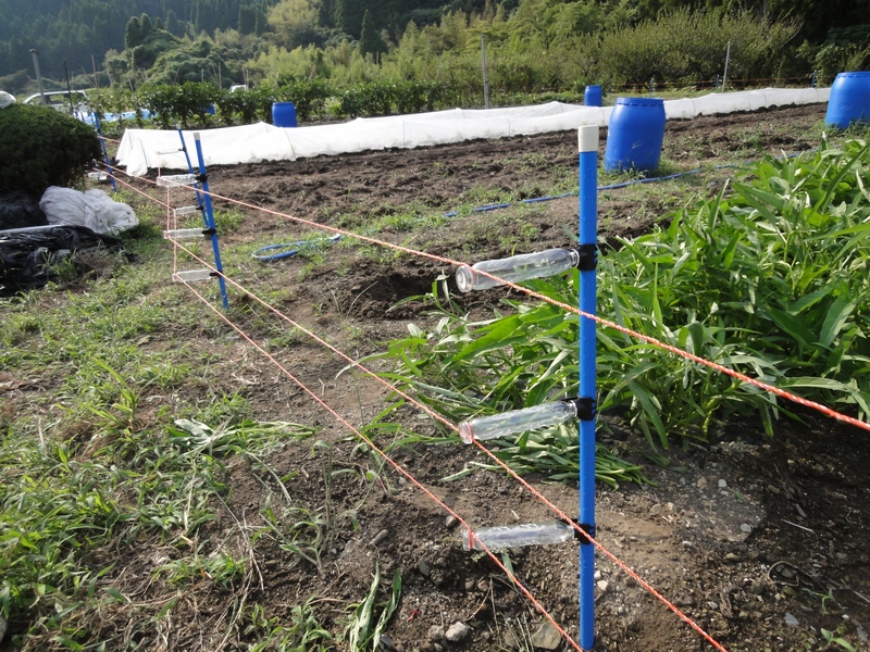 ペットボトルを埋めて種を蒔く穴を作っています。