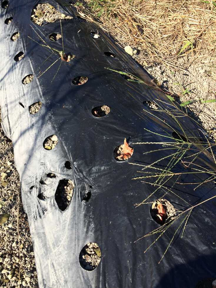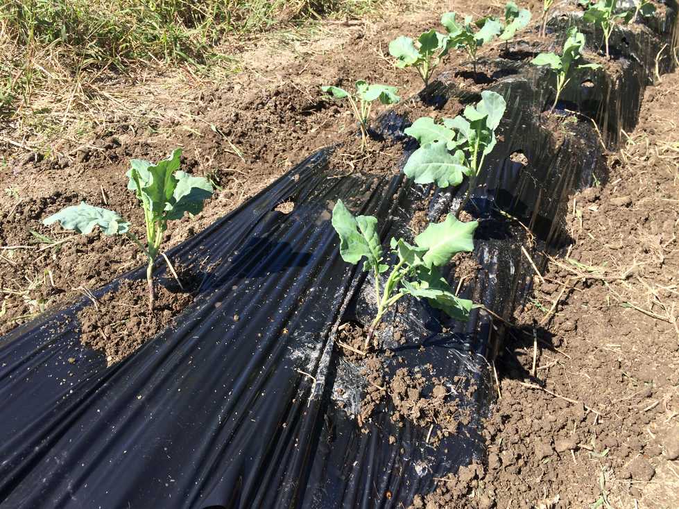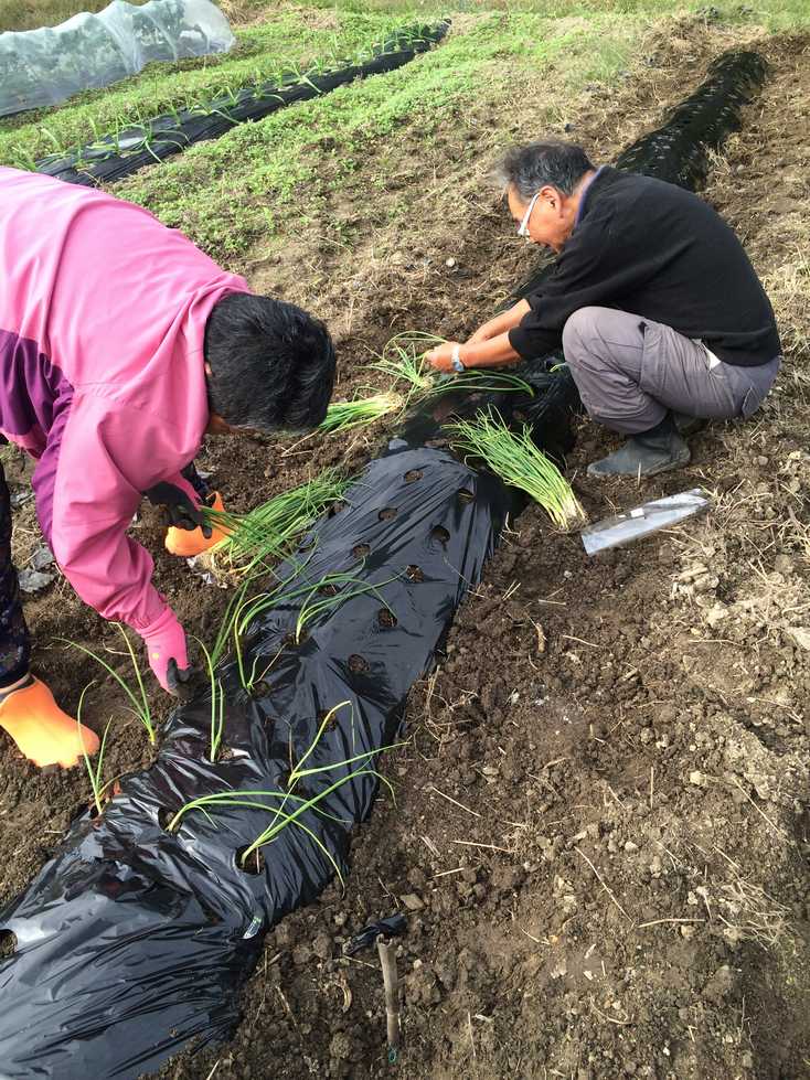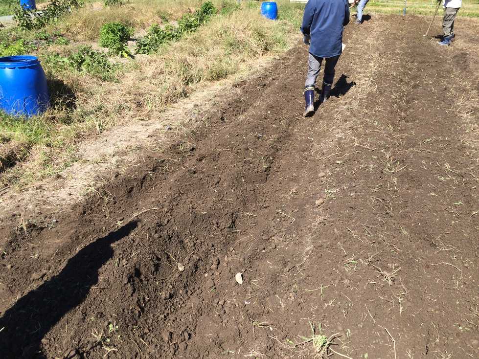 午後からの実習では肥料等をまいた後、耕うん、うね立てをし、タマネギ、ソラマメの苗にはマルチを張り定植しました。