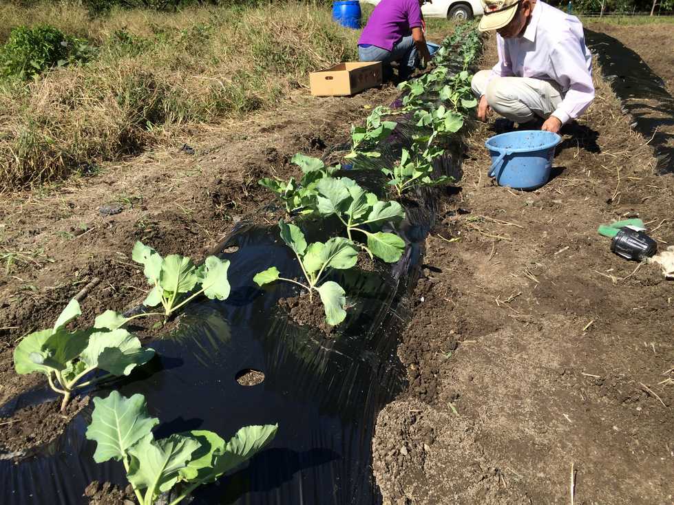 耕うんし畝をつくり、キャベツ、ブロッコリーの苗植え