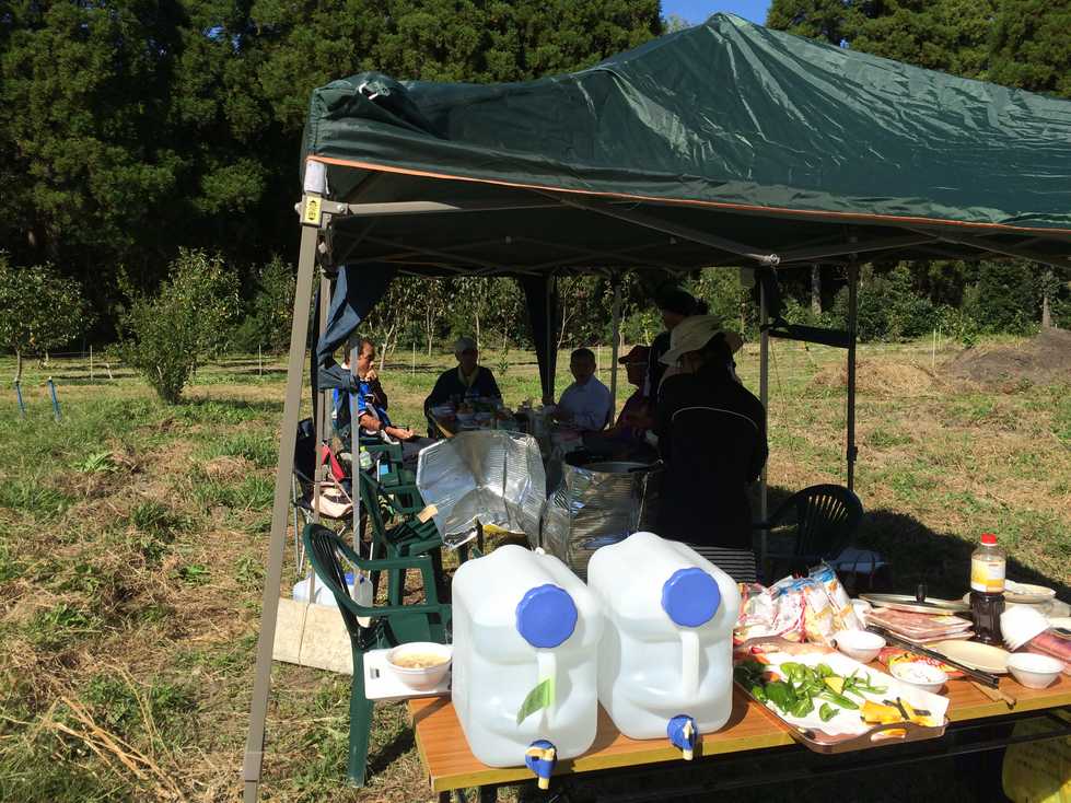 交流会ということで受講者とそのご家族、ご友人などを交えて畑で採れた野菜や皆さんが持ち寄ってくれた食材等を使い昼食をつくりました。食材の準備をしてくださった方々に感謝!