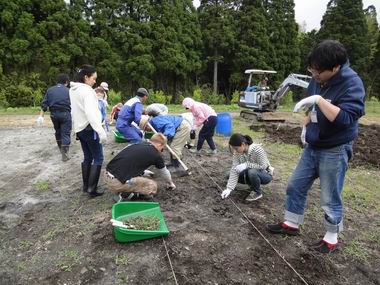 まずは全員で畑の草取り。広い畑の草取りは大変と思いきや14名での一斉作業であっという間に草が無くなりました。