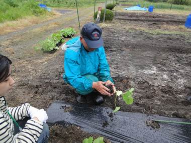 いよいよ植栽。マルチに穴を開けて丁寧にかぼちゃの苗を植えました。