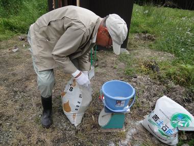 丁寧に石灰と肥料を撒きます。