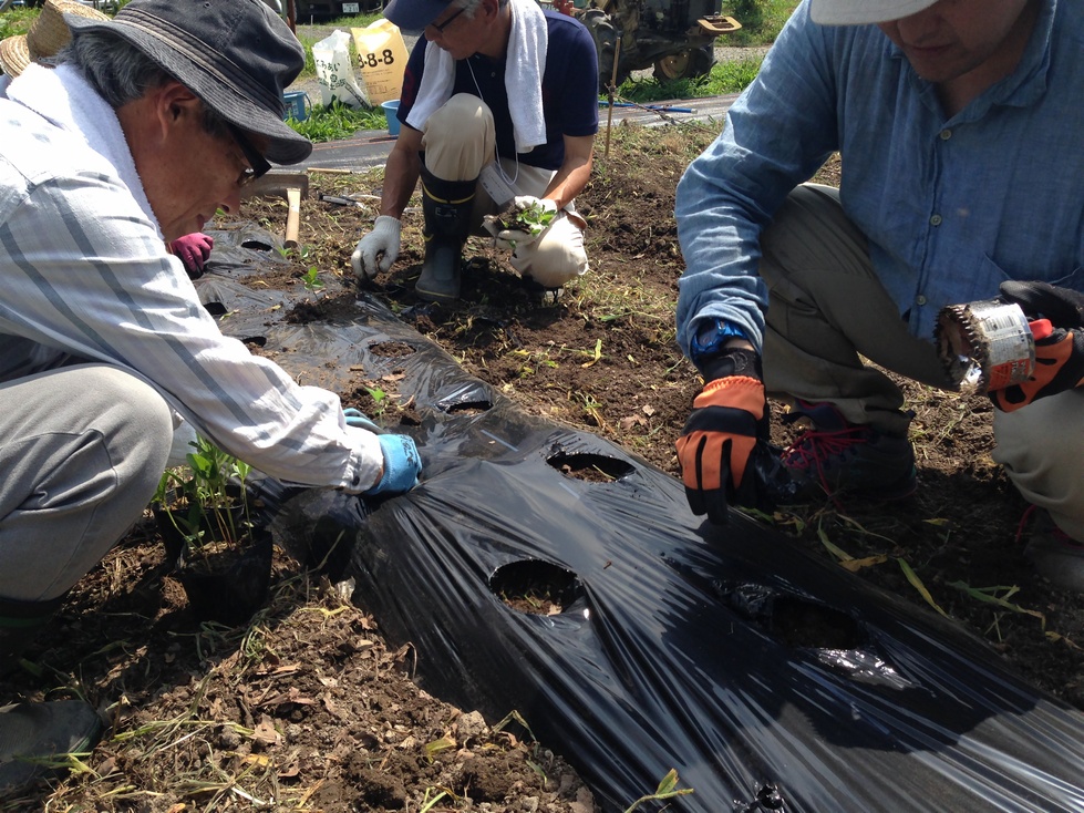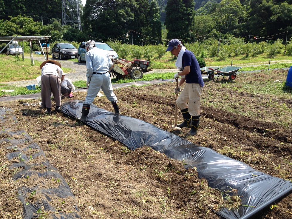 肥料等をまき耕運し、畝を作り、マルチを張ります