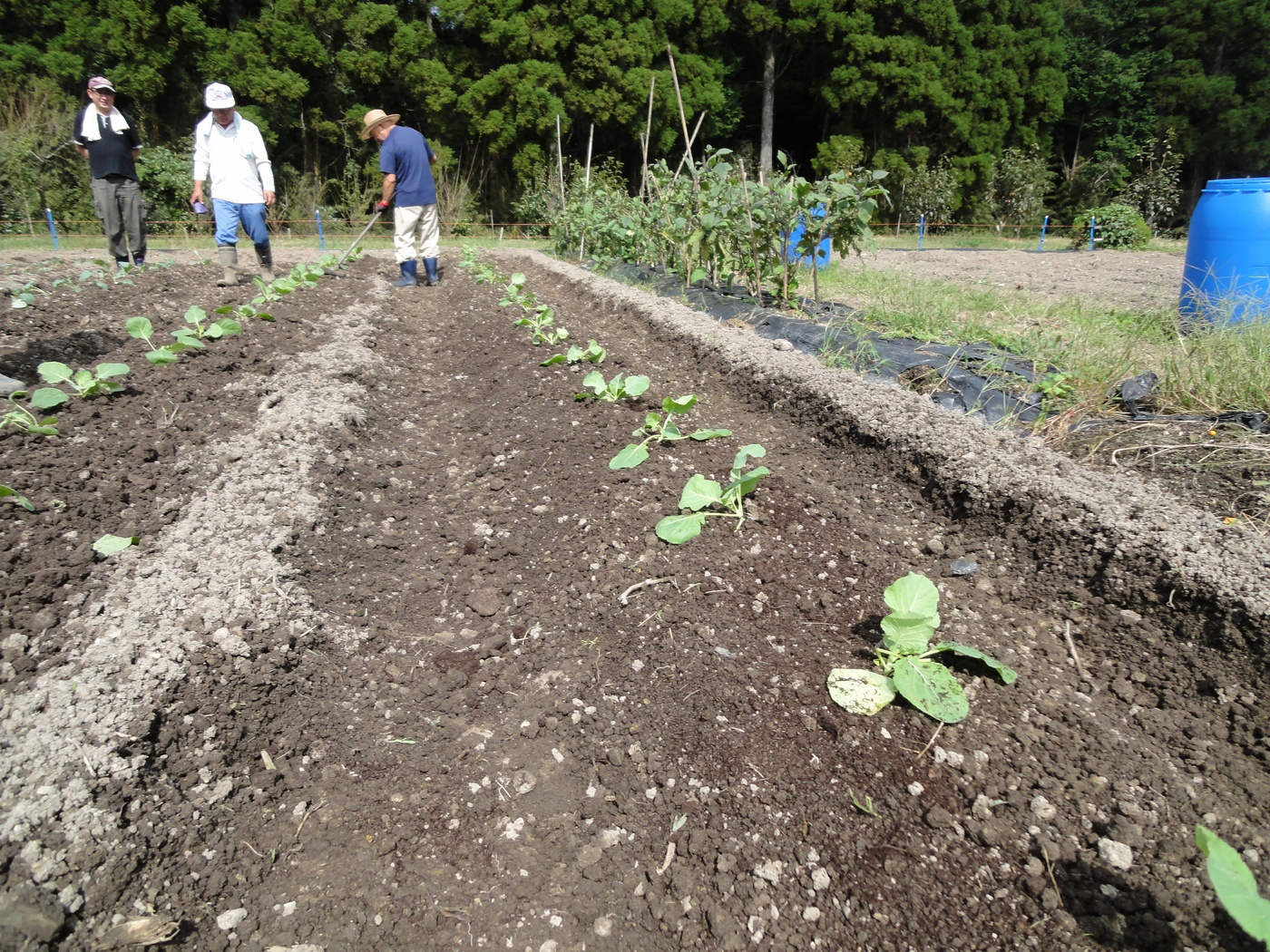 ナバナ、ハクサイ、ダイコンの草取り、間引きをしています。