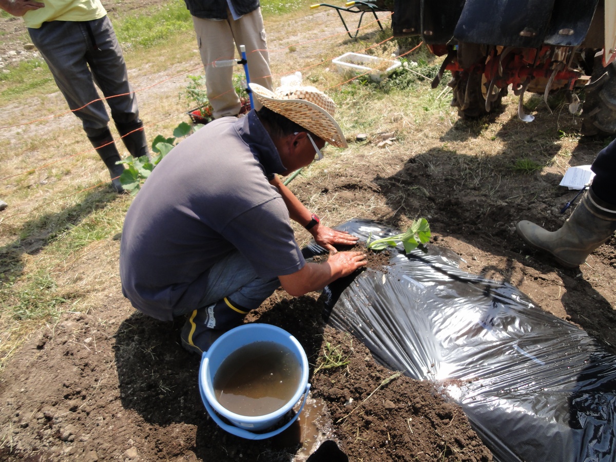 今回は、カボチャ、メロン、ミニトマトの苗植え、エダマメ、スイートコーンの種をまきました。
