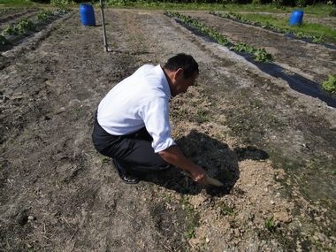 主任による枝豆の育ち具合のチェック!!入念に生育状況を観察しています。