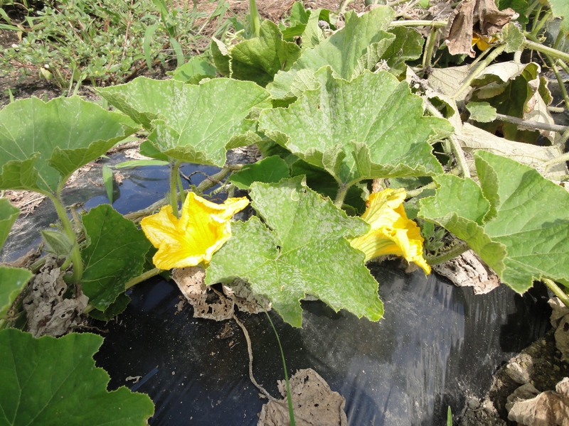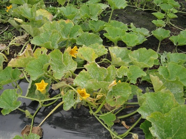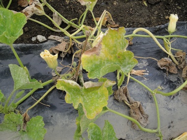 かぼちゃの一部が葉が白くなり生育が悪くなっています。
