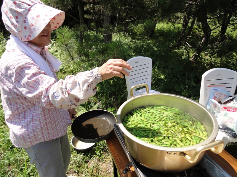 畑で収穫したエダマメを茹でています。