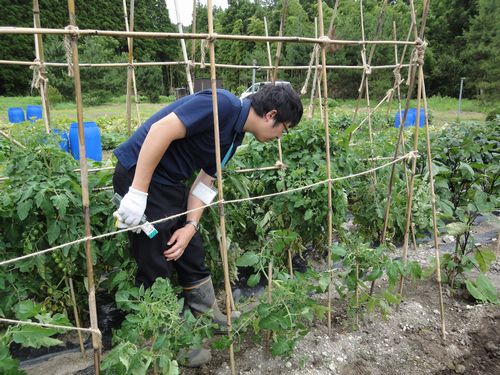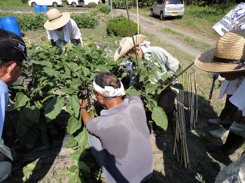 そして引き続き、ナスを竹で三本仕立てにする作業です!!