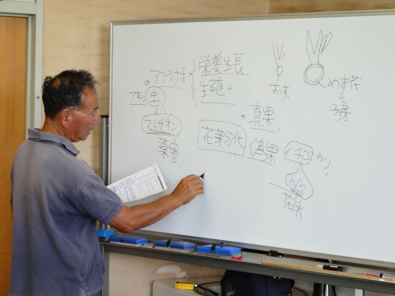 午前は、「野菜の分類と特徴」、「ニンジン、クウシンサイ、秋エダマメ種まき」の講義をしていただきました。