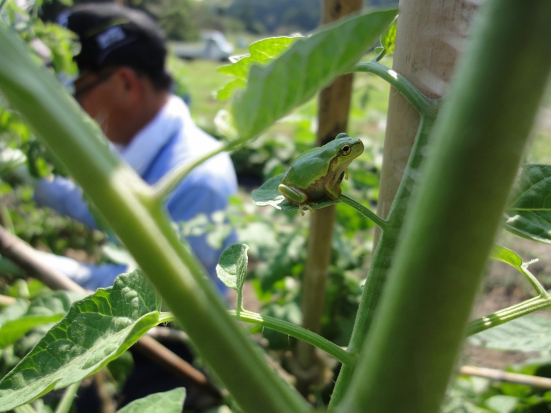 暑い中、作業しているとミニトマトの葉っぱの上にカエルがいました。