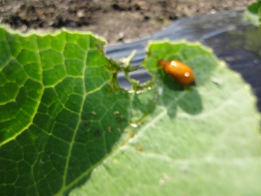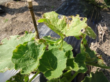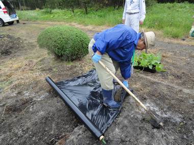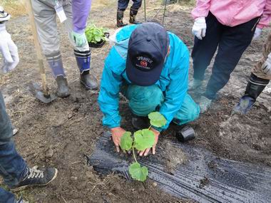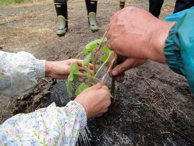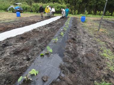 いよいよ植栽。マルチに穴を開けて丁寧にかぼちゃの苗を植えました。