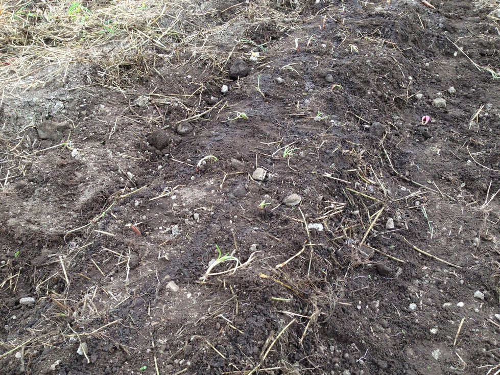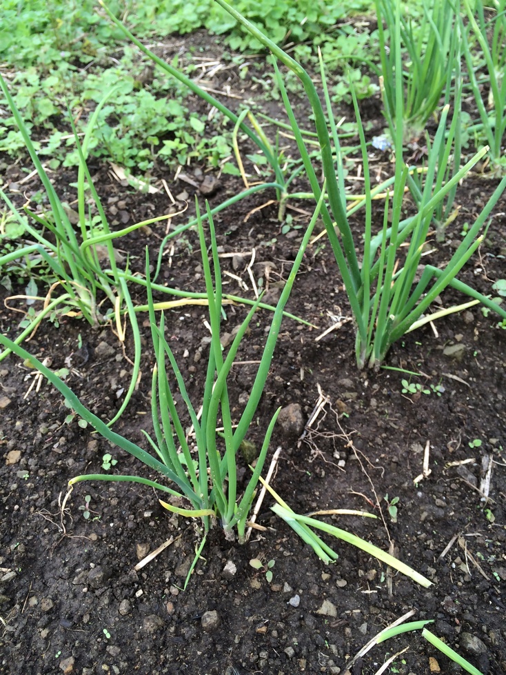 写真では見えずらいですがワケギです。薄皮を剥いで2条植えしました。