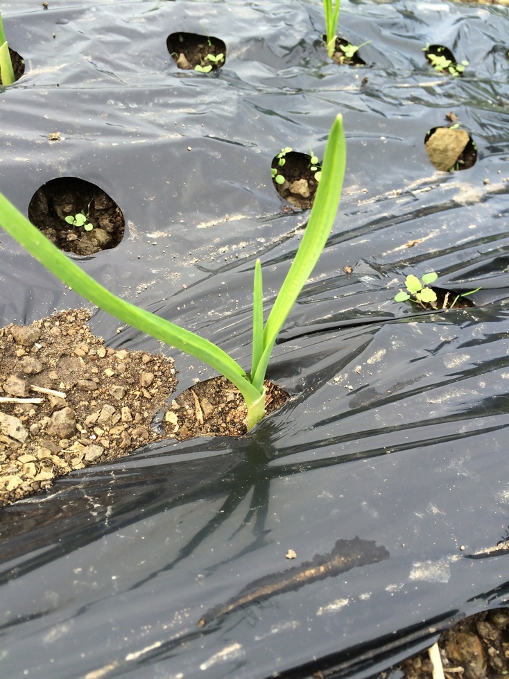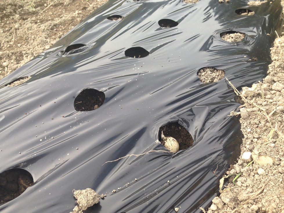 ニンニクは肥料を入れ穴空きマルチをはり植えつけをしました。