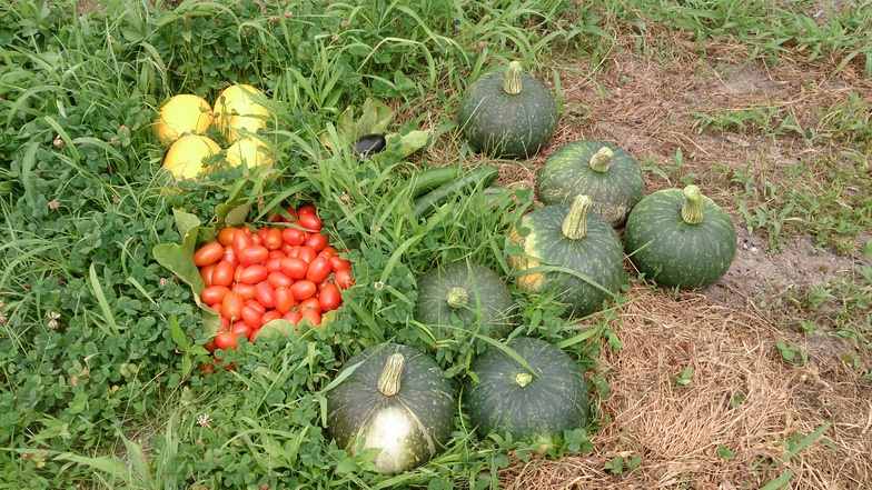 メロン、カボチャ、ミニトマト、ナスが収穫できました